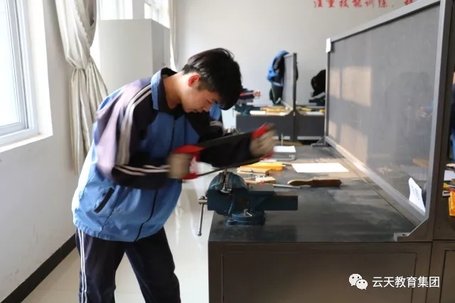 参加钳工技能测试的同学熟练地运用操作专业工具,或挫,或锯,冰冷的钢铁在他们手上变成了一件精细的零件,学生们将自己平时所学理论、所练的技能得以发挥,在竞争中找到动力,也增强了对专业和技能学习的热爱。