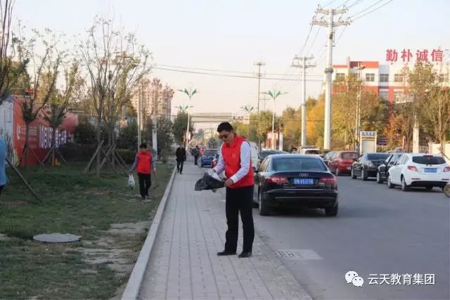 下午4时,慈善义工们在云天教育集团副总刘存民、渤海中专校长王占强、云天中学校长孙海涛的带领下从云天职业技术学院门口出发,拿着卫生工具,沿着青年街一路向北,志愿者们的红色服装如一团团火焰,他们随手将垃圾捡起,还深入树丛清理卫生死角,每次垃圾袋装满后,志愿者就将垃圾袋放入垃圾桶中。经过1个多小时的辛勤忙碌,沿路垃圾被一扫而光。