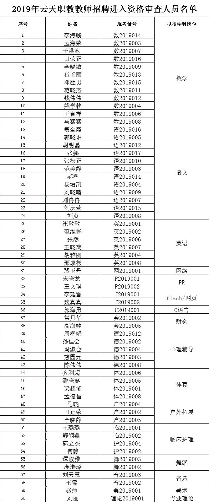 经过笔试、技能测试、面试等环节,共有60名考生进入本次教师招聘资格审查范围。 请进入资格审查范围人员于7月9日下午14:30到山东云天职业技术学院(厚德楼101)进行资格审查及缴纳体检费用(300元现金)。 资格审查需携带本人身份证、毕业证、学位证报到证、教师资格证、职业资格证书、荣誉证书等原件及复印件各一份。过时不到者视为自动放弃本次教师招聘资格。