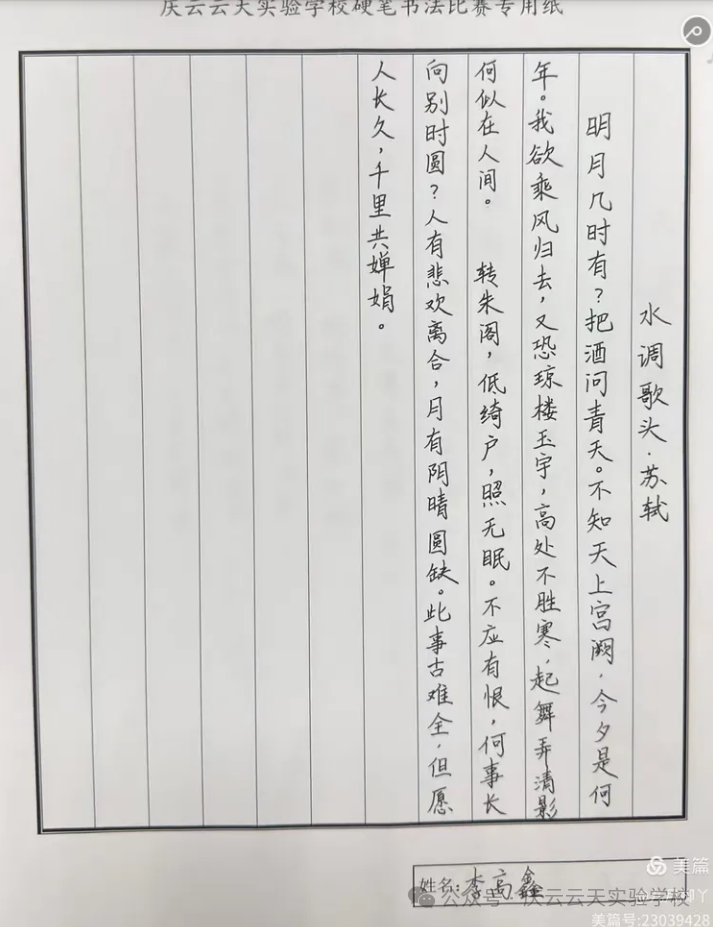 一字一世界,一笔一乾坤。为传承中华优秀传统文化,丰富校园文化生活,培养学生良好的汉字书写习惯,提升语文核心素养,我校近日成功举办了以“翰墨飘香,笔尖传承”为主题的语文书法大赛。本次活动覆盖小学组至九年级,吸引了众多书法爱好者同台竞技,共同呈现了一场精彩纷呈的笔墨盛宴。