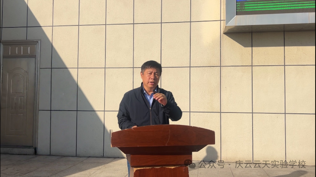 庆云云天实验学校校长张金海同志致开幕词。他首先向积极参与筹备工作的师生表示感谢,并向全体运动员致以亲切问候。张校长指出,体育是立德树人的重要载体,是学生成长成才的基石。他勉励同学们在赛场上赛出风格、赛出水平,享受运动乐趣,锤炼意志品质,并预祝本届运动会圆满成功。