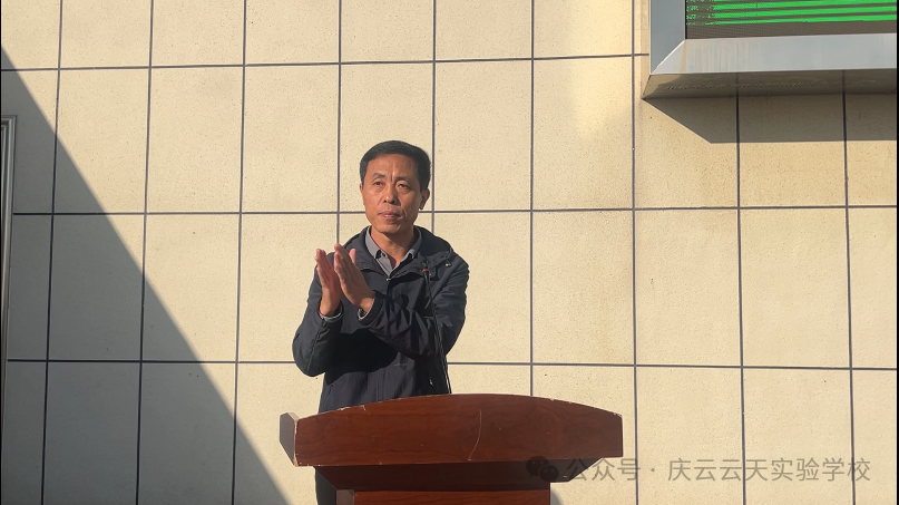 庆云云天实验学校校长张金海同志致开幕词。他首先向积极参与筹备工作的师生表示感谢,并向全体运动员致以亲切问候。张校长指出,体育是立德树人的重要载体,是学生成长成才的基石。他勉励同学们在赛场上赛出风格、赛出水平,享受运动乐趣,锤炼意志品质,并预祝本届运动会圆满成功。